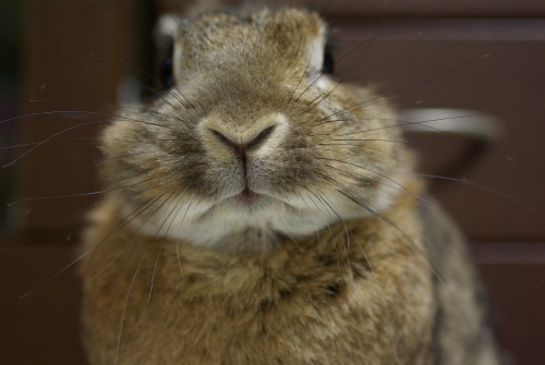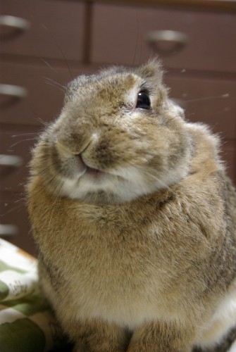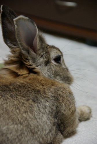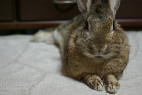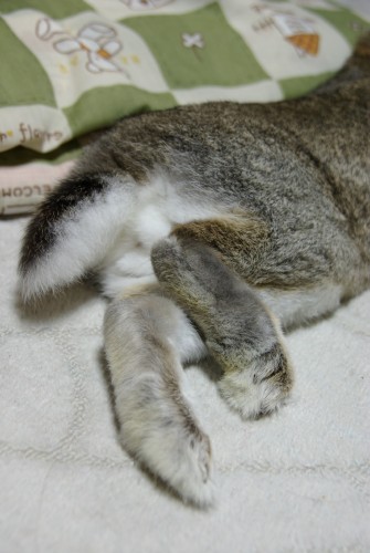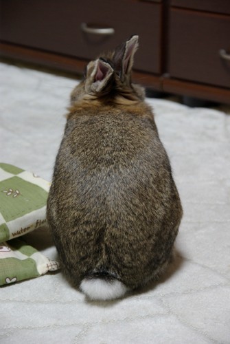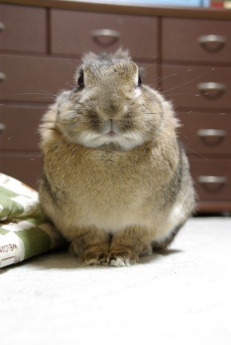 ●2008.02.23 うさぎにも生活のリズムがあるようで、見ていて面白いと思うことがあります。 まずは一緒に起きて真似してご飯(牧草)。その後まったりして朝ご飯の時間。その後放牧中はストーカー。 午後の誰もいない時間はお昼寝かな。夫が帰宅して放牧すると午前とは違ってまったりタイム。 まったりが寝る前まで続き、寝る前に元気に走り出す・・・・。 ちーの一日はそんなかんじなのです。