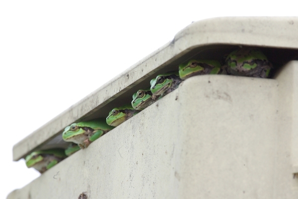 かえるマンション カエルちゃん、みんなこっち向いてるの。 かわいいったらありゃしない。 10匹足らずのかえるマンション。 カエルって、ちゃんと自分の家に帰ってくるって話をどこかで見た。 数年前に玄関先のハンギングの鉢を家にしていたおやびん(♀)も朝には帰ってきてたもの。