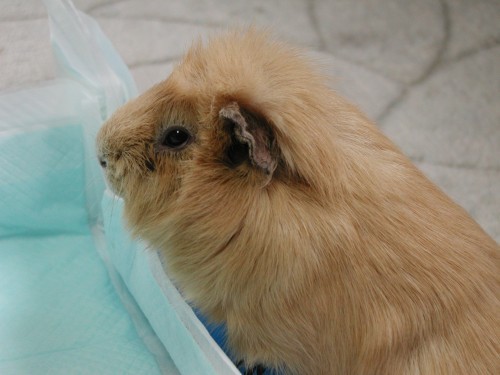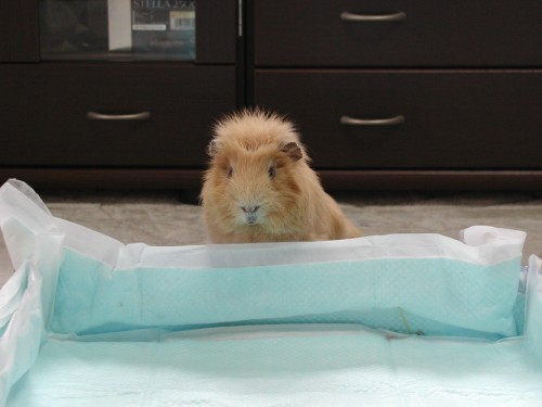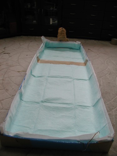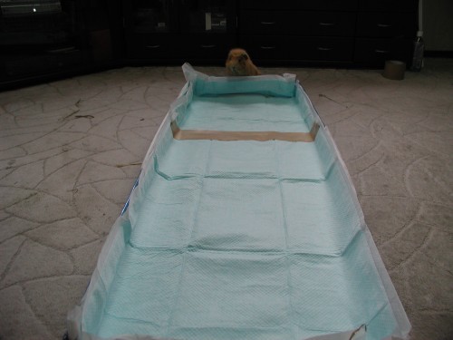 もーちゃんのおうち。こんなに広くなりました。ペットシーツも漏れないようにテープでとめて。